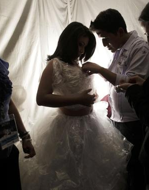 Los ayudantes daban los últimos toques de maquillaje, ajustes de las creaciones de diseñadores ecuatorianos a exhibir en el desfile del Día de la Moda Biónica, organizado por la Fundación Jóvenes Contra el Cáncer en el Centro Cultural Metropolitano de la capital ecuatoriana.